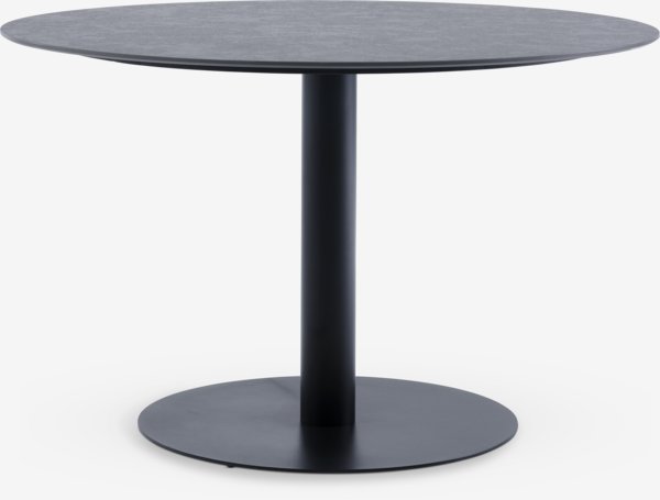 Rundt hagebord med grå bordplate i sement med travertin-look. Matchende understell i pulverlakkert stål. Ø120 x H74 cm