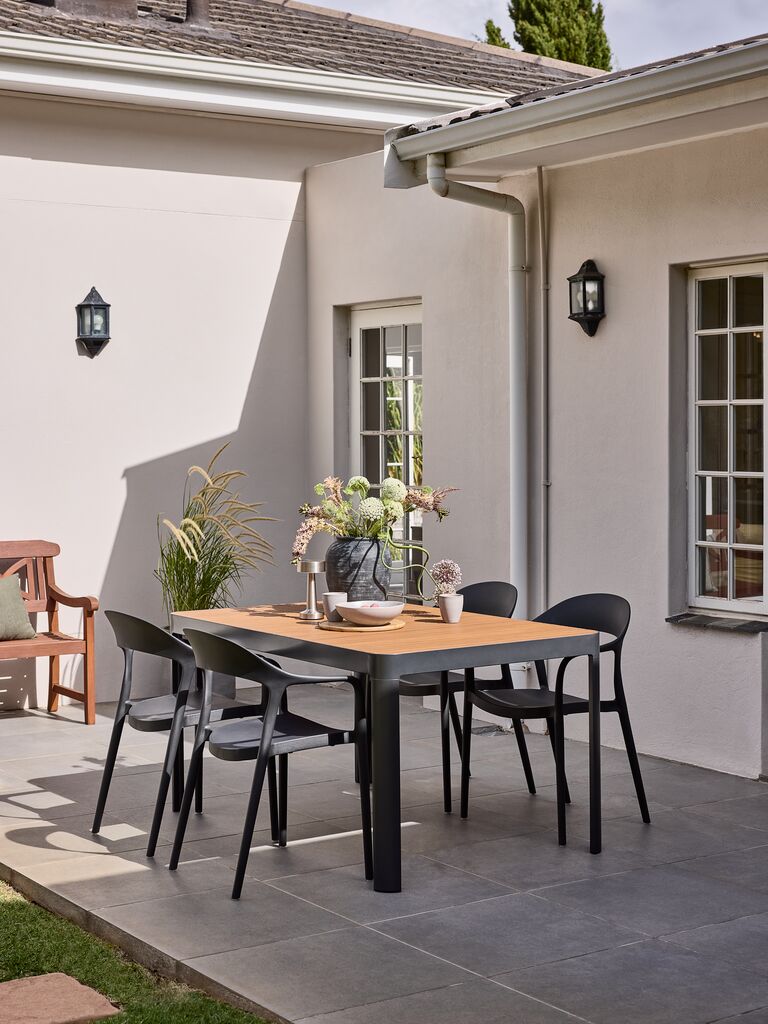 4-seters hagemøbelsett. Bord: Aluminium og oljebehandlet FSC®-hardtre. B91 x L149 x H75 cm. Stol: UV-beskyttet plast. Kan stables.