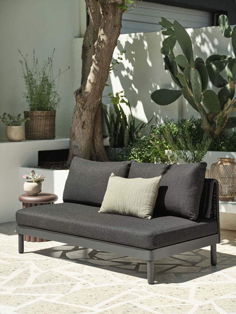 2-seters loungesofa i aluminium, stål og petan. Inkl. eksklusive puter med slitesterkt, strukturvevd trekk. B160 x H72 x D86 cm