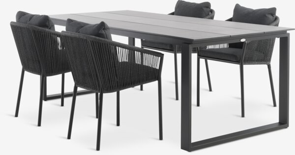 4-seters hagemøbelsett. Aluminium og DURAWOOD® komposittre. DURAWOOD® er et slitesterkt komposittmateriale som består av FSC® hardtrefiber og plast. B100 x L215 x H75 cm. Stol: Aluminium og polyester. Inkl. eksklusive puter med hurtigtørkende strukturvevd trekk. Trekket har et vanntett belegg på innsiden som hindrer vann i å trenge inn i puten. Kan stables.