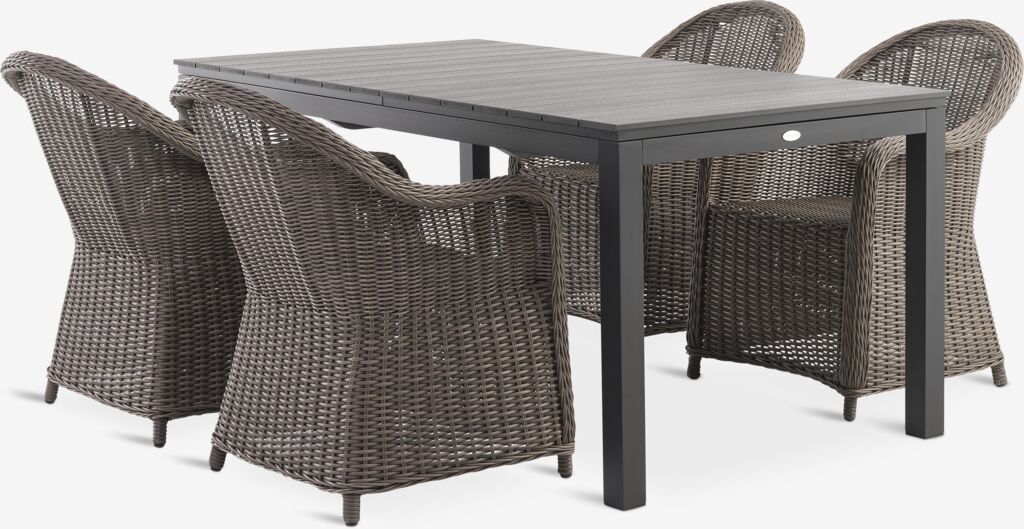 4-seters hagemøbelsett. Bord: Aluminium og kunsttre. Inkl. 2 klaffer som kan oppbevares under bordplaten. B95 x L172/229/276 x H76 cm. Stol: Aluminium og petan.