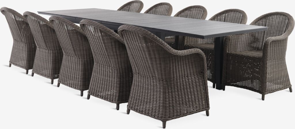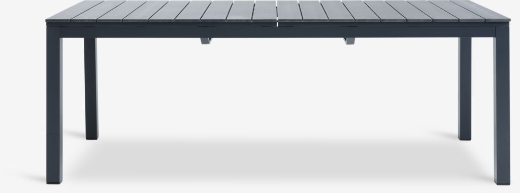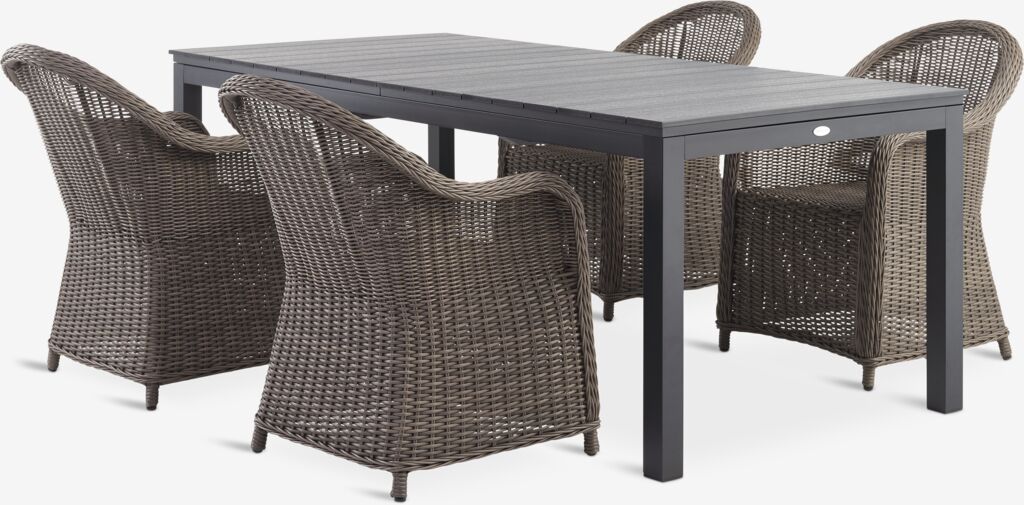 4-seters hagemøbelsett. Bord: Aluminium og kunsttre. Inkl. 2 klaffer som kan oppbevares under bordplaten. B95 x L206/264/321 x H76 cm. Stol: Aluminium og petan.