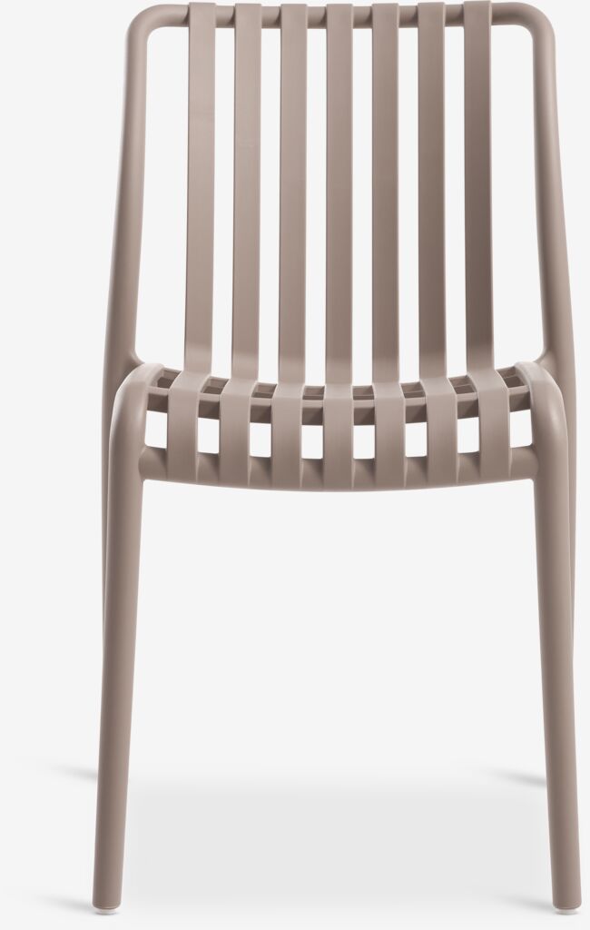 Mørk sandfarget stablestol i plast, som er UV-beskyttet for å forhindre at fargen falmer. Hagestolen kan stables for kompakt oppbevaring.