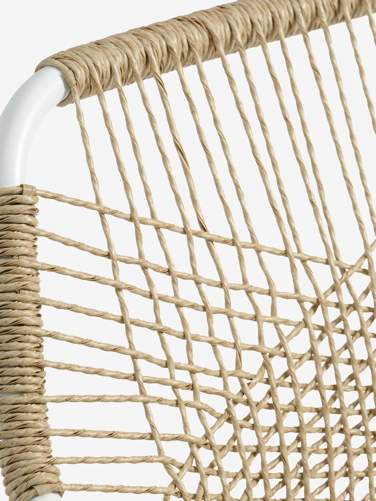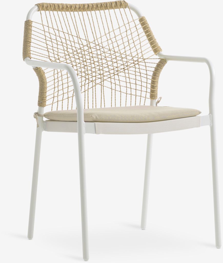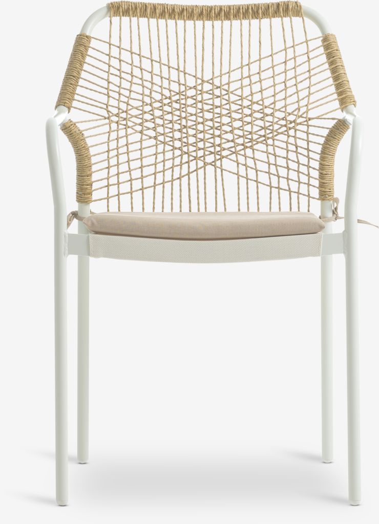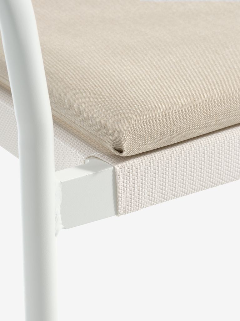 Hvit stablestol med sete i textilene og ryggstøtte i petan. Inkludert kvalitetspute med slitesterkt trekk. Ramme i pulverlakkert aluminium. Textilene er et behagelig, fargeekte materiale som tørker raskt og er lett å rengjøre. Petan gir et naturlig flettet utseende, samtidig som det er værbestandig og vedlikeholdsfritt. Aluminium er et lett og robust materiale som ikke ruster. Hagestolen kan stables for kompakt oppbevaring.