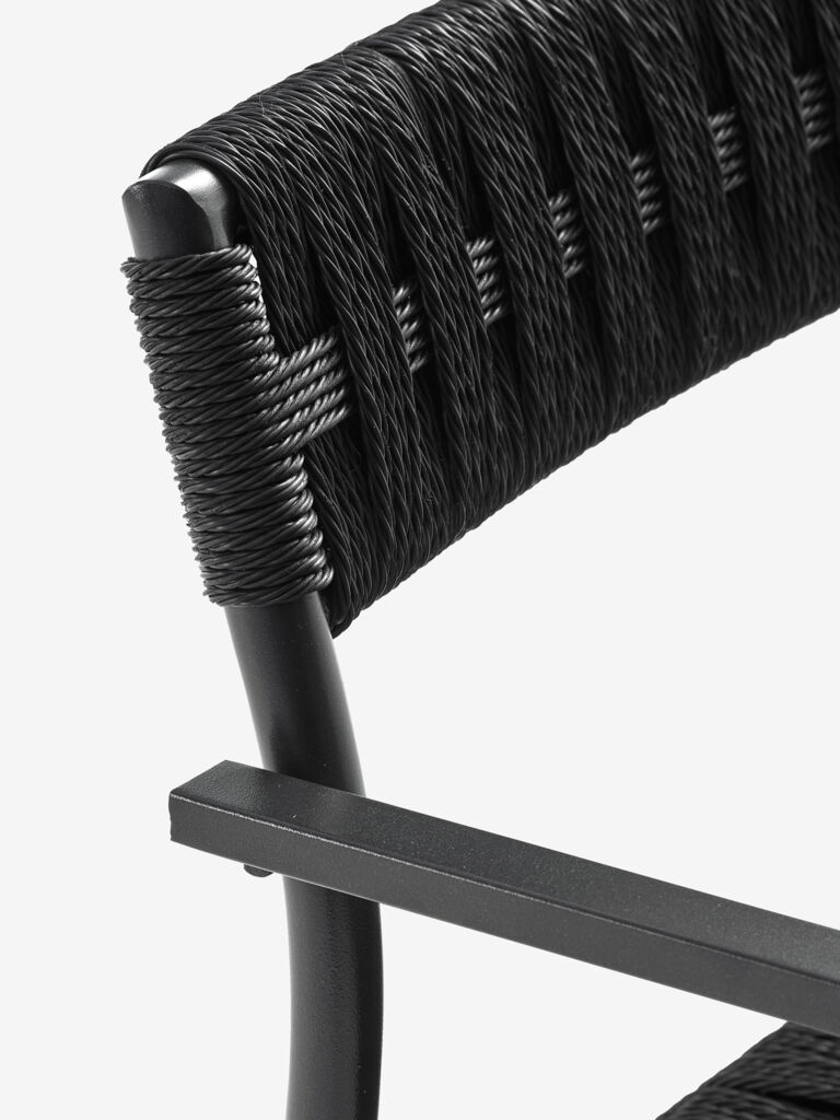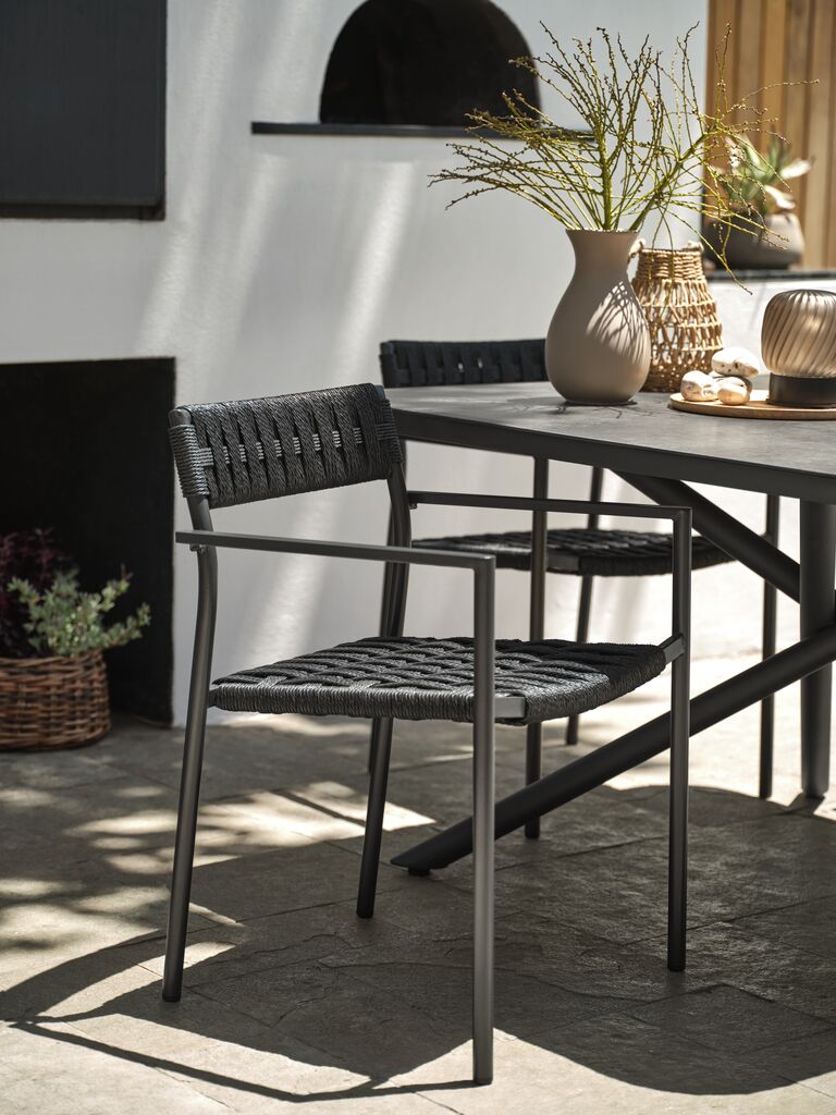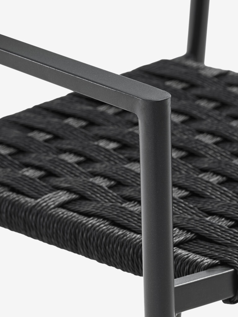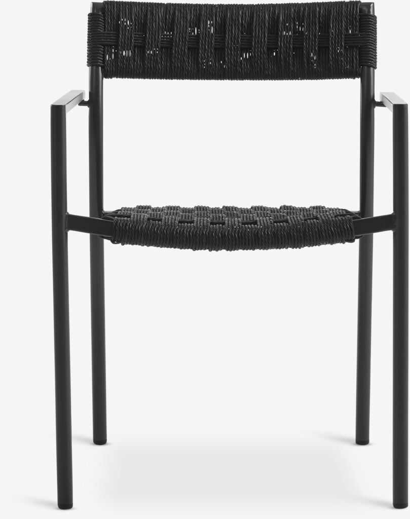 Svart stablestol med sete og rygg i petan og ramme i pulverlakkert stål. Petan gir et naturlig rottingutseende, samtidig som den er værbestandig og vedlikeholdsfri. Hagestolen kan stables for kompakt oppbevaring.