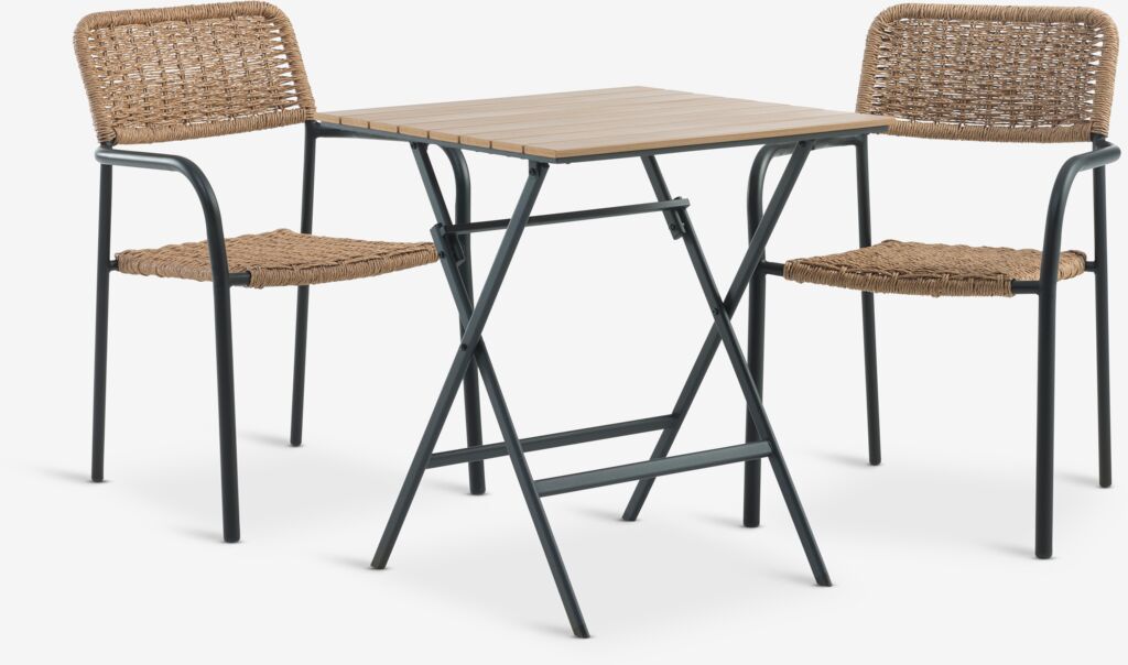 2-seters kafésett. Bord: Stål og kunsttre. Kan klappes sammen. B65 x L65 x H73 cm. Stol: Stål og petan. Kan stables.