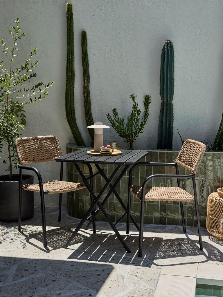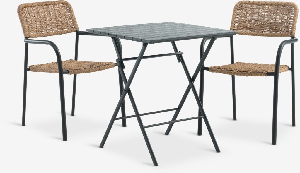 2-seters kafésett. Bord: Stål og kunsttre. Kan klappes sammen. B65 x L65 x H73 cm. Stol: Stål og petan. Kan stables.