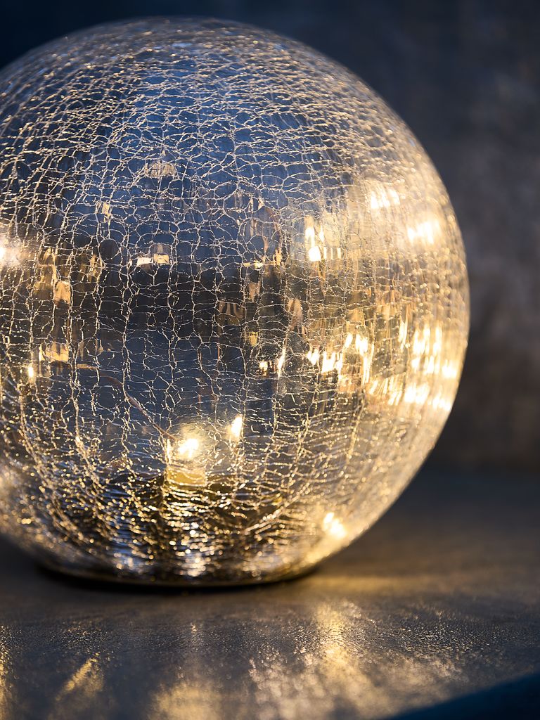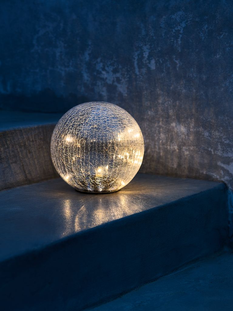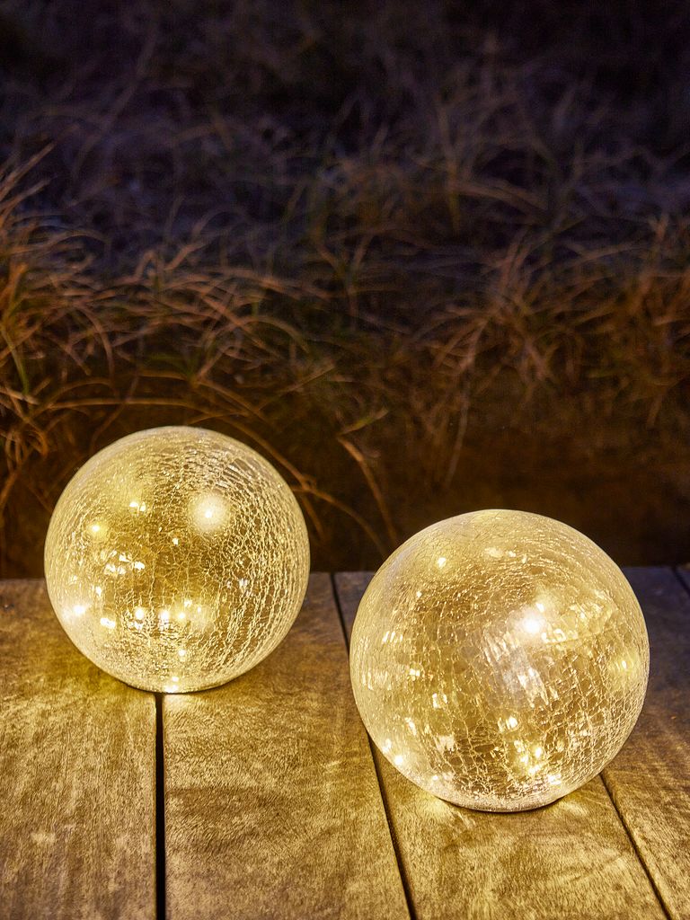 Solcellelampe med en klar glasskule med slipt look. I løpet av dagen lader solcellepanelet inni batteriet, og ved skumring vil lampen automatisk lyse opp. Lampen er plassert på et spyd som enkelt kan settes i bakken. Ø20 x H29 cm