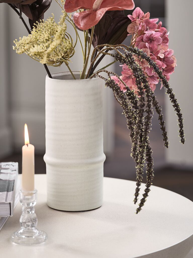 Vase laget av hvit keramikk med et enkelt design, ideell for friske blomster eller som et dekorativt element. Ø12 x H25 cm
