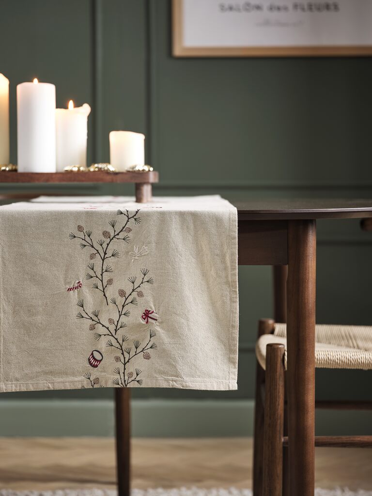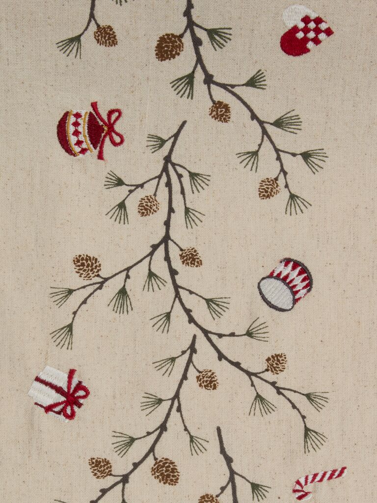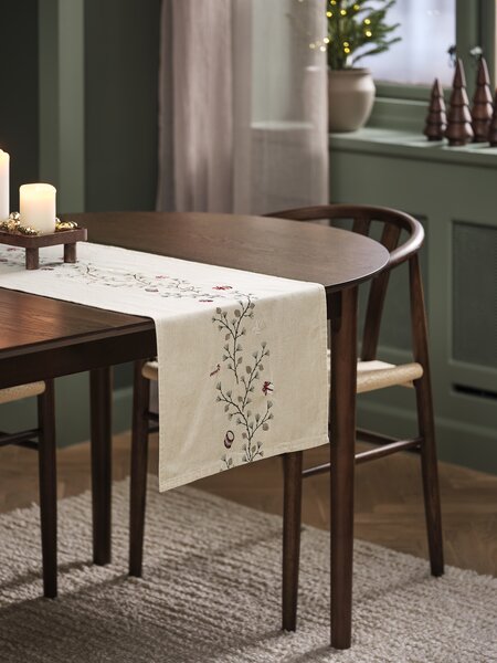 Bordløper i en naturfarget bomulls- og linblanding med et delikat, printet mønster og broderte julemotiver. Den tilfører et koselig preg til ditt julespisebord. 40x150 cm