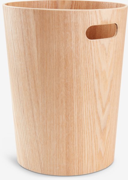 Papirkurv laget av askefinér og poppelkryssfinér, med en naturlig trefinish som komplementerer moderne interiør. Har integrerte håndtak for enkel flytting. Ø23 x H30 cm