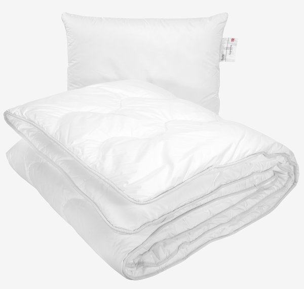 Dyne-/putesett med fiberpute og termodyne som består av to sammensydde dyner. Det isolerende luftrommet mellom dynene gir en jevn varme uten kuldebroer. Dyne med luftig, isolerende fyll av silikoniserte, spiralformede hulfiber, 2x650 g. Pute med silikonisert kulefiberfyll, 550 g. Putens høyde kan reguleres ved å ta ut noe av fyllet. Både dyne og pute har myke trekk i 100% bomullscambric. Vask 60°C. Inkl. oppbevaringsveske. Dyne 140x200 cm. Pute 50x70 cm