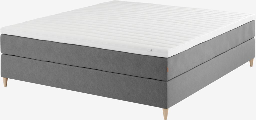 Kontinentalseng 150x200 cm. 1 vendbar madrass med pocket-fjærer 200/m² polstret med polyeterskum. 1 overmadrass, 7 cm tykk med polyeterskumkjerne. Vaskbart trekk med myk, tykk quilting. Nederst 1 ramme. Inkl. ben. Sengegavl kjøpes separat.