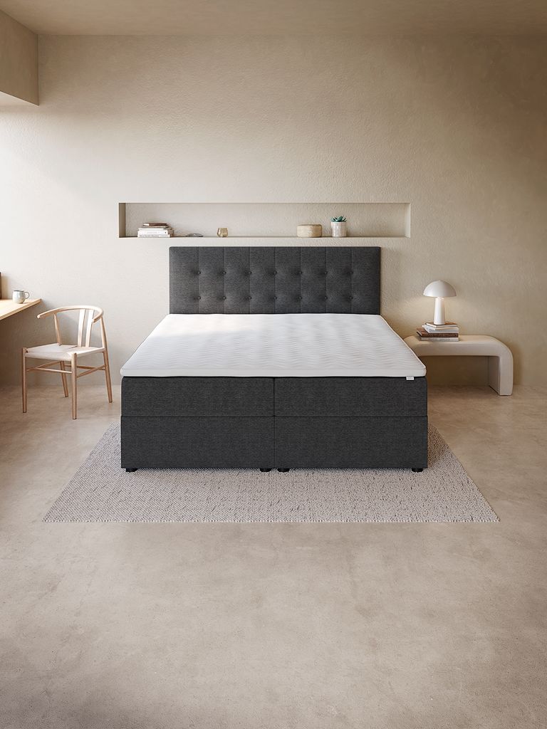 Kontinentalseng 150x200 cm. 2 madrasser med pocket-fjærer 233/m², polstret med polyeterskum. 1 overmadrass, 6 cm tykk med trykkavlastende memoryskumkjerne som former seg presist etter kroppens konturer. Vaskbart trekk med tykk, myk quilting. Nederst 2 rammer. Med oppbevaringsrom. Inkl. ben. Sengegavl kjøpes separat.