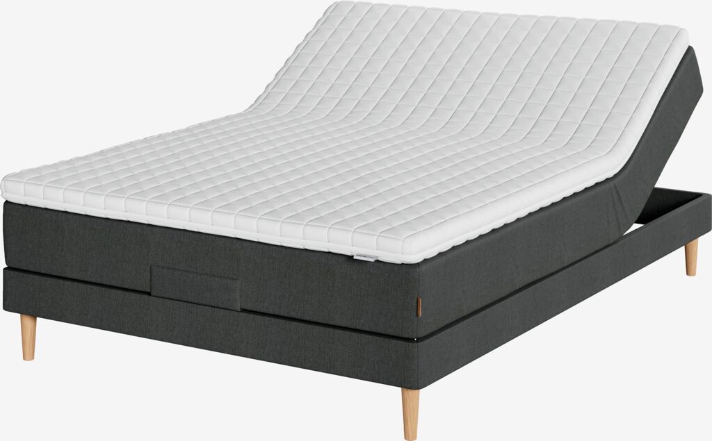 Regulerbar seng 140x200 cm med trådløs fjernkontroll. 1 vendbar madrass med pocket-fjærer 226/m², polstret med polyeterskum. Madrassen er inndelt i 5 komfortsoner som gir korrekt og optimal støtte. 1 overmadrass, 5 cm tykk med trykkavlastende gelskumkjerne som tilpasser seg kroppen din og leder bort overskuddsvarme. Vaskbart trekk i 100% polyester (100% resirkulert) med tykk, myk quilting. 1 regulerbar bunn. Ben/bøyler kjøpes separat.