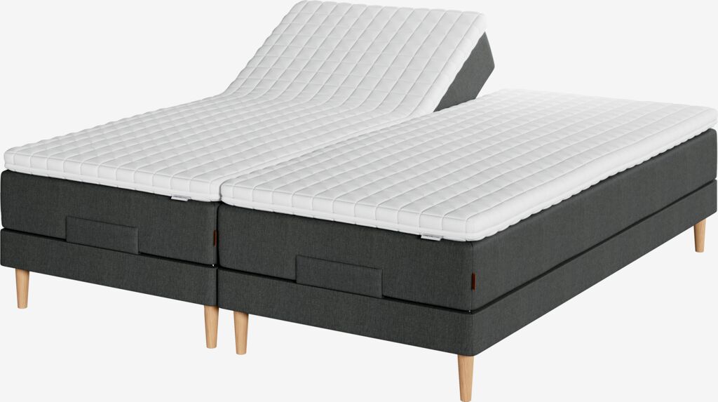 Regulerbar seng 180x200 cm med trådløs fjernkontroll. 2 vendbare madrasser med pocket-fjærer 226/m², polstret med polyeterskum. Madrassene er inndelt i 5 komfortsoner som gir korrekt og optimal støtte. 2 overmadrasser, 5 cm tykke med pustende latekskjerne som effektivt leder bort overskuddsvarme. Vaskbart trekk i 100% polyestermikrofiber (100% resirkulert) med tykk, myk quilting. 2 regulerbare bunner. Ben/bøyler kjøpes separat.