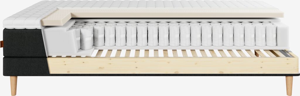 | Fjærlag 1 (øverst) | 15 cm Hver enkelt pocket-fjær er beskyttet av en stoffpose som gjør madrassen fleksibel, øker levetiden og reduserer lyd. |