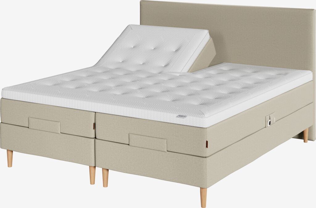 Regulerbar seng 180x200 cm med trådløs fjernkontroll. 2 madrasser med innebygd regulerbar bunn og pocket-fjærer 267/m², polstret med kaldskum og polyeterskum. Madrassene er inndelt i 7 komfortsoner som gir presis og optimal støtte. 1 overmadrass, 8 cm tykk med praktisk splitt i hodeenden. Med denne overmadrassen unngår du mellomrommet mellom sengene, og hodeendene kan bevege seg uavhengig av hverandre. Madrassen har kjerne av pustende lateks som effektivt leder bort overskuddsvarme. Trekk med tykk, myk quilting. Trekket inneholder temperaturregulerende mikrokapsler som skaper et tørt og komfortabelt sovemiljø. Ben/bøyler og sengegavl kjøpes separat.