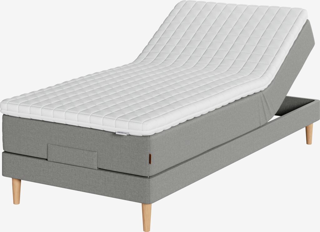 Regulerbar seng 90x200 cm med trådløs fjernkontroll. 1 vendbar madrass med pocket-fjærer 226/m², polstret med polyeterskum. Madrassen er inndelt i 5 komfortsoner som gir korrekt og optimal støtte. 1 overmadrass, 5 cm tykk med trykkavlastende memoryskumkjerne som former seg presist etter kroppens konturer. Vaskbart trekk i 100% polyester (100% resirkulert) med tykk, myk quilting. 1 regulerbar bunn. Ben/bøyler kjøpes separat.