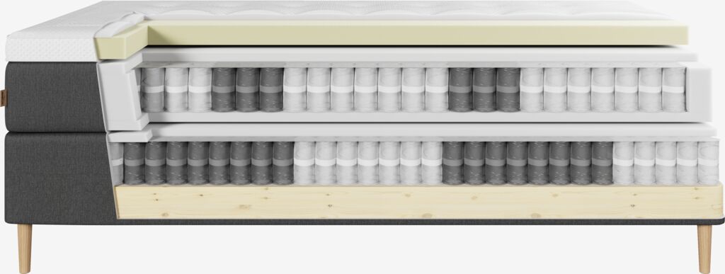 | Fjærlag 1 (øverst) | 15 cm Hver enkelt pocket-fjær er beskyttet av en stoffpose som gjør madrassen fleksibel, øker levetiden og reduserer lyd. |
