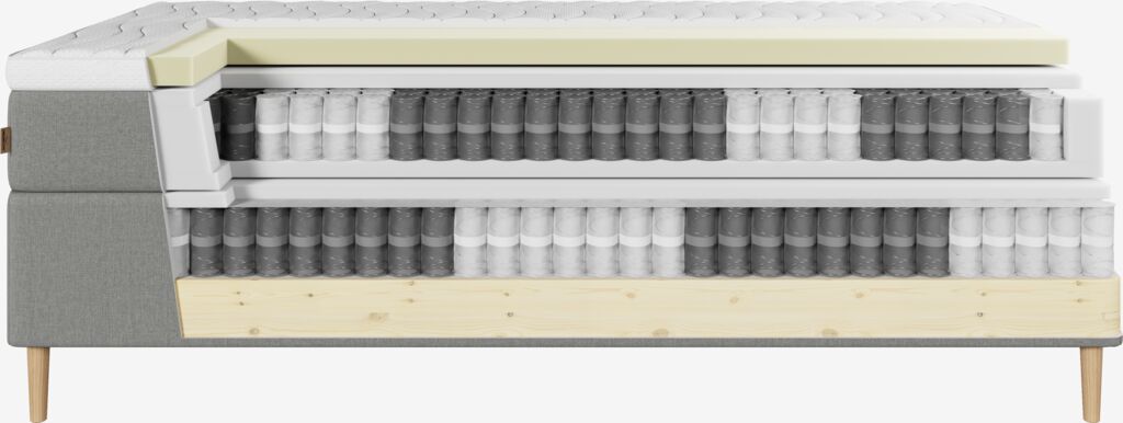 Rammemadrassen gir forbedret stabilitet og støtte for madrassen over. Den inneholder pocket-fjærer og polyeterskumtype, som bidrar til en mer balansert søvnopplevelse.