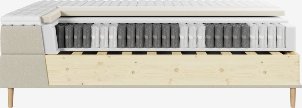 | Fjærlag 1 (øverst) | 15 cm Hver enkelt pocket-fjær er beskyttet av en stoffpose som gjør madrassen fleksibel, øker levetiden og reduserer lyd. |