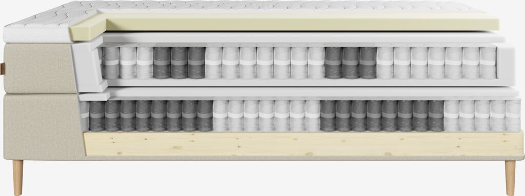 | Fjærlag 1 (øverst) | 15 cm Hver enkelt pocket-fjær er beskyttet av en stoffpose som gjør madrassen fleksibel, øker levetiden og reduserer lyd. |