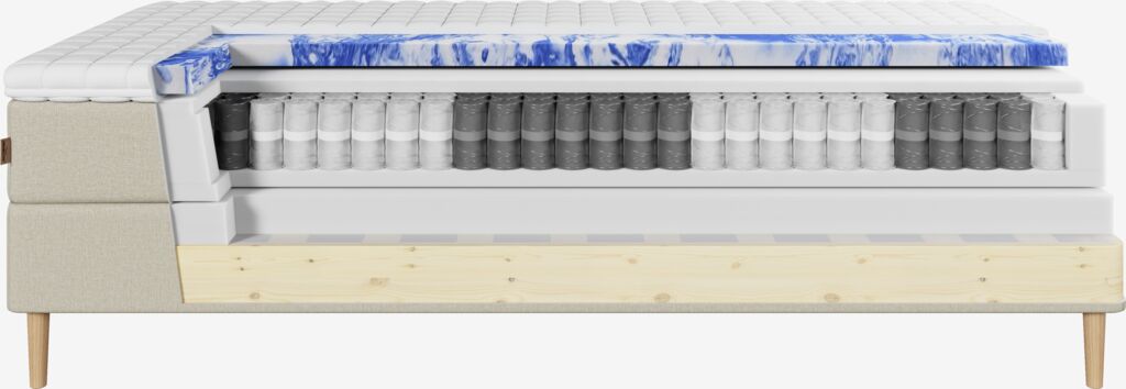 Gelskum tilpasser seg kroppen din. Det fordeler vekten jevnt, noe som bidrar til å avlaste muskler og ledd. Den åpne cellestrukturen og gelkulene i skummet bidrar til å øke luftstrømmen og lede bort overflødig varme. Det kan gjøre at sengen føles litt mykere. Trekket kan vaskes på 60°C.