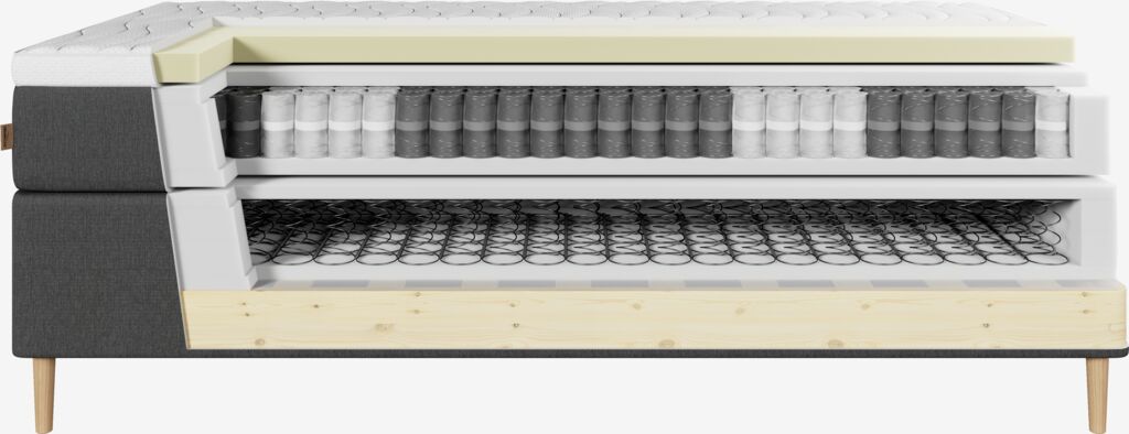Kontinentalseng 90x200 cm. 1 vendbar madrass med pocket-fjærer 248/m², inndelt i 7 komfortsoner og polstret med polyeterskum. 1 overmadrass, 6 cm tykk med trykkavlastende memoryskumkjerne. Trekket er behandlet med biocidet GREENFIRST®. Nederst 1 rammemadrass. Ben/bøyler og sengegavl kjøpes separat.