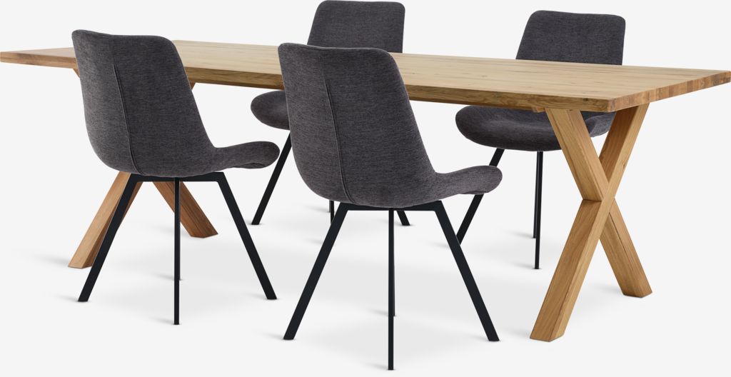 Bord: Massiv eik og eikefinér. Klaffer kjøpes separat. B100 x L230 x H75 cm. Stol: Stofftrekk. Med svingfot i stål.