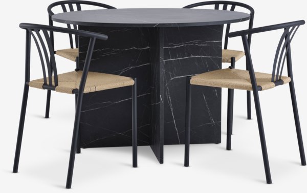 KRONDAL Ø110 bord marmor-look + 4 JYDERUP stol svart/natur