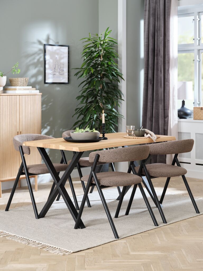 Bord: Massiv eik og stål. B80 x L140 x H75 cm. Stol: Stofftrekk og stål.