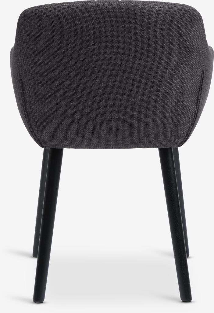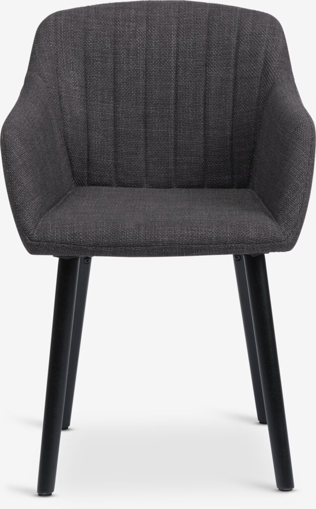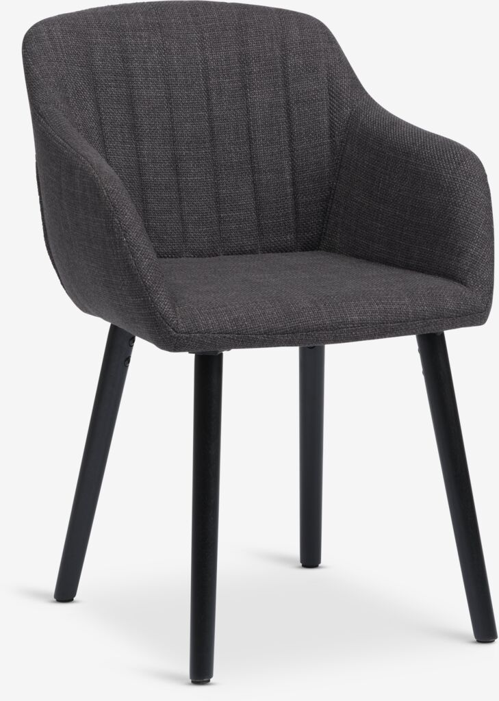 Spisestol med armlener som gir ekstra støtte og komfort. Stolen har polstret sete og rygg i antrasittgrått stoff. Ben i massivt tre.