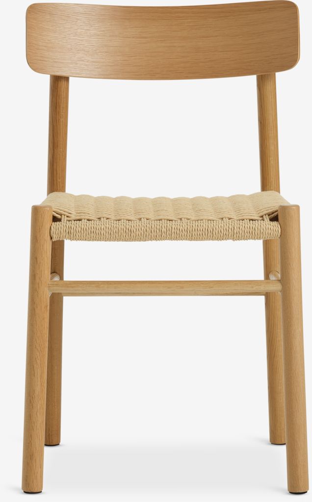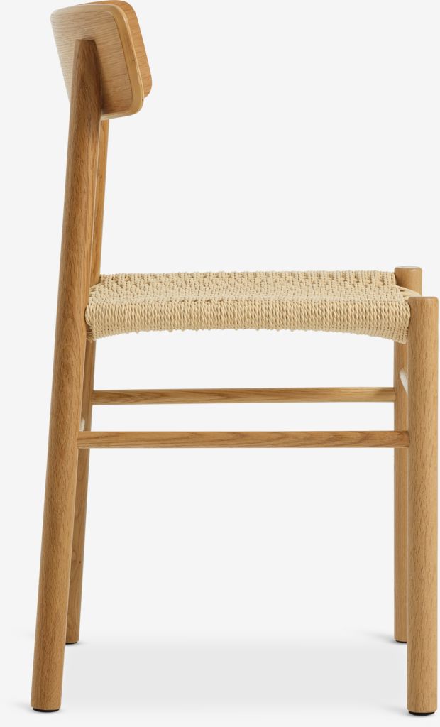 Spisestol med sete i flettet papirgarn og ramme i massiv eik og eikefinér. Treet er lakkert for forlenget holdbarhet.